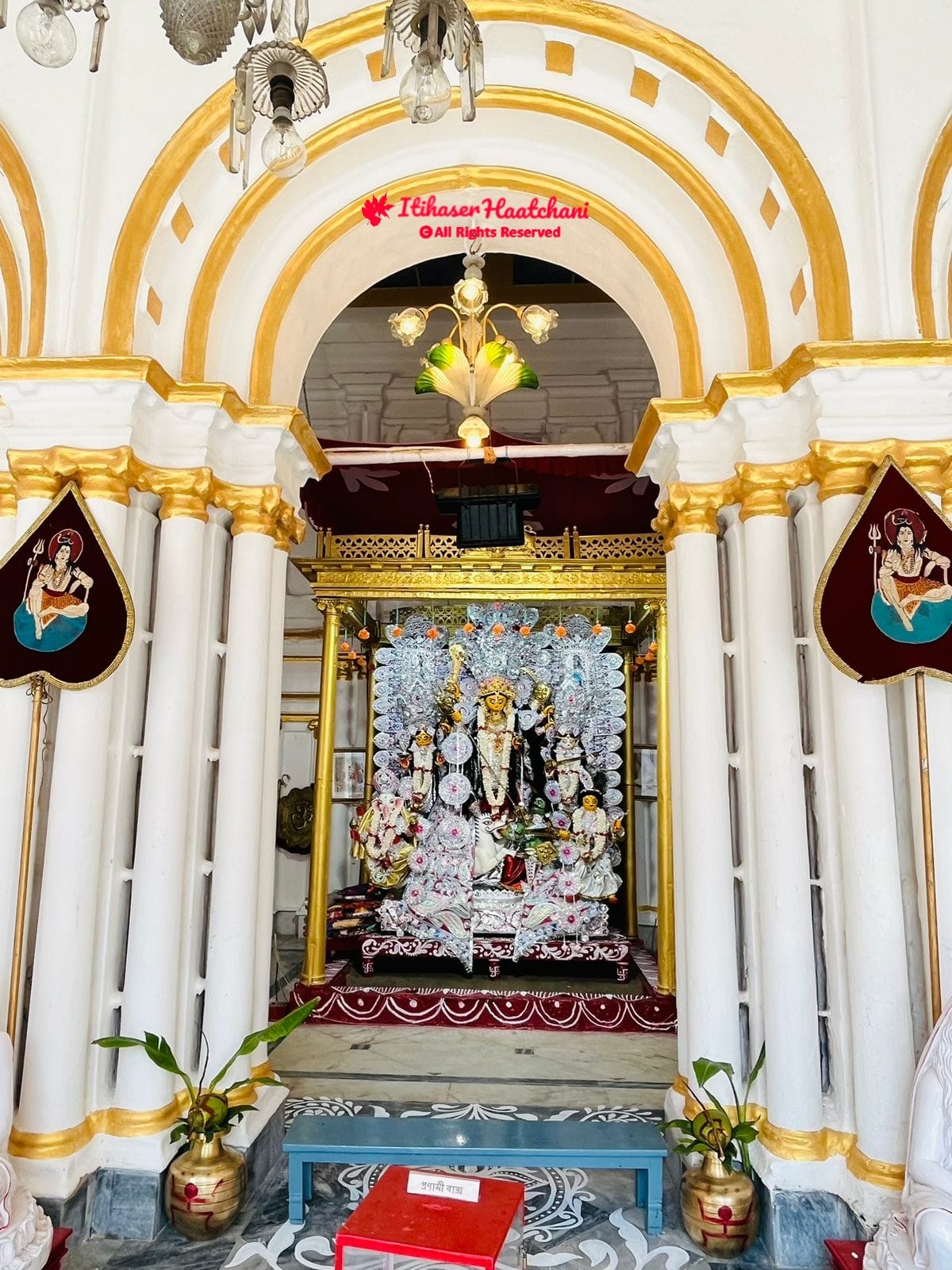 সাবেক ভদ্রাসনের ঠিক পাশেই পাঁচ খিলান বিশিষ্ট দুর্গা দালান সহ্ প্রাসাদসম এই বাড়ি তৈরি করে সেখানেই খেলাত বাবু সাড়ম্বরে শুরু করেন দুর্গোৎসব।শহরের অভিজাত বনেদি বাড়ির পুজোগুলোর মধ্যে অন্যতম এই পুজো। রুপোলী রাংতা মোড়া সিংহাসনে দেবী বিরাজ করেন।প্রতিমার পিছনের চালি মঠচৌড়ি অর্থাৎ তিন চালি।এখানে দেবীর বাহন ঘোটকাকৃতি সিংহ।পুজোতে লুচি মিষ্টি মন্ডা ভোগের সাথে থাকে চিনির মঠ।পরিবারের লোক ছাড়াও বর্তমানে বাড়ির দেখাশোনার দ্বায়িত্বে রয়েছেন ৫ জন কর্মচারী যারা মূলত দেখেন অফিসের হিসাব,তাদের অধীনস্থ কর্মচারীর সংখ্যা অগুনতি।রাজা রাণীর গল্প ত আর নেই এখন তবুও তাঁদের মুখেই শুনলাম জীবিত রয়েছেন রাণীমা।কলকাতার বুকে এইসময় দাঁড়িয়ে রাণীমা কথাটা শুনে কিঞ্চিৎ অবাক লাগলেও বুঝতে অসুবিধা হলো না এই পরিবারের এটাই হয়তো সম্বোধনের রীতি।পুজো দেখার সাথে সাথে ঘুরে দেখলাম বাড়ির আনাচে কানাচে,খানিকটা ইতিহাসের পাতায় উঁকি ঝুঁকি মারার চেষ্টা আর কি!